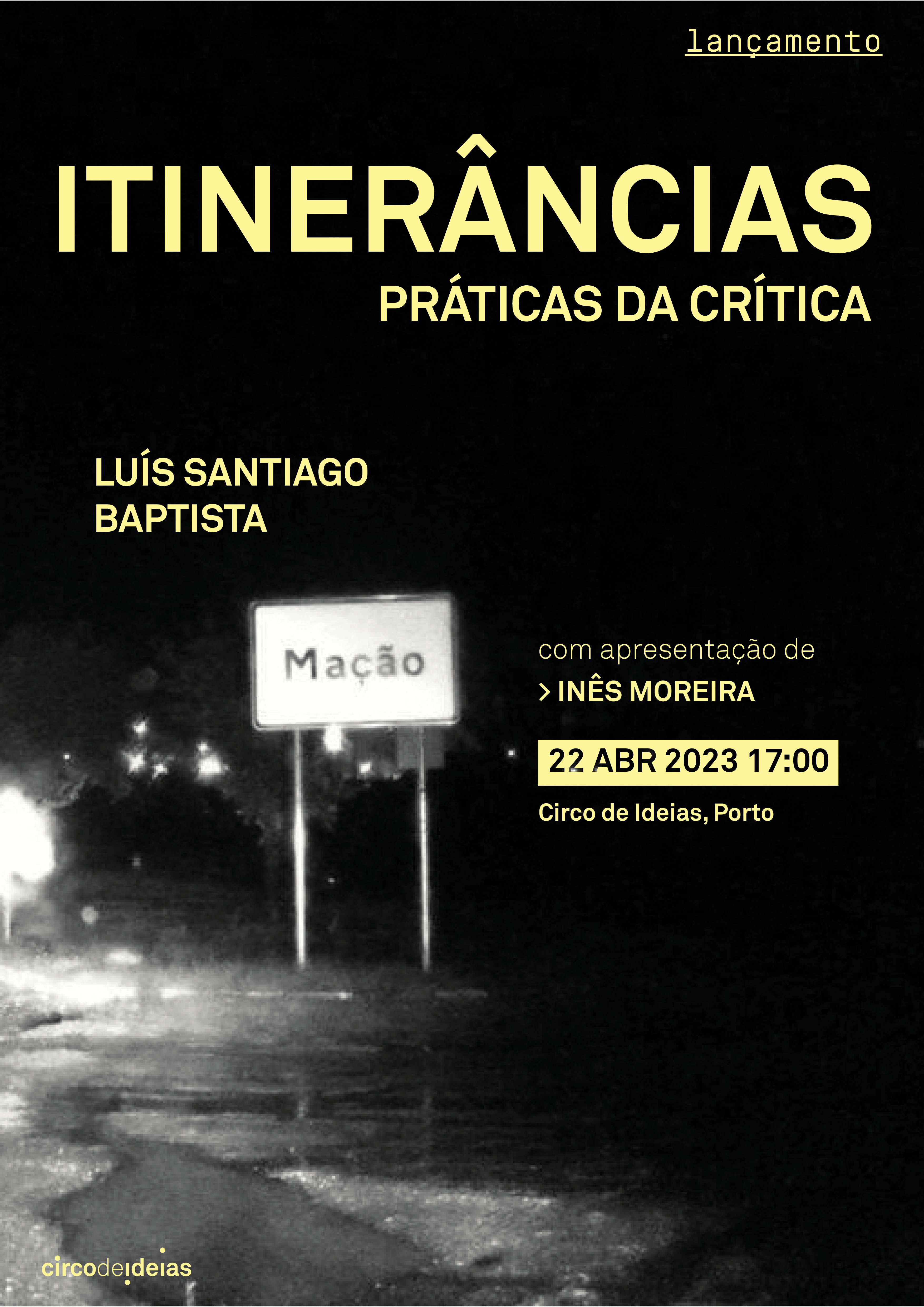 O livro «Itinerâncias: práticas da crítica», com autoria de Luís Santiago Baptista, foi apresentado na Circo de Ideias, com uma conversa entre Inês Moreira e o autor, no dia 22 de Abril, sábado, às 17:00.